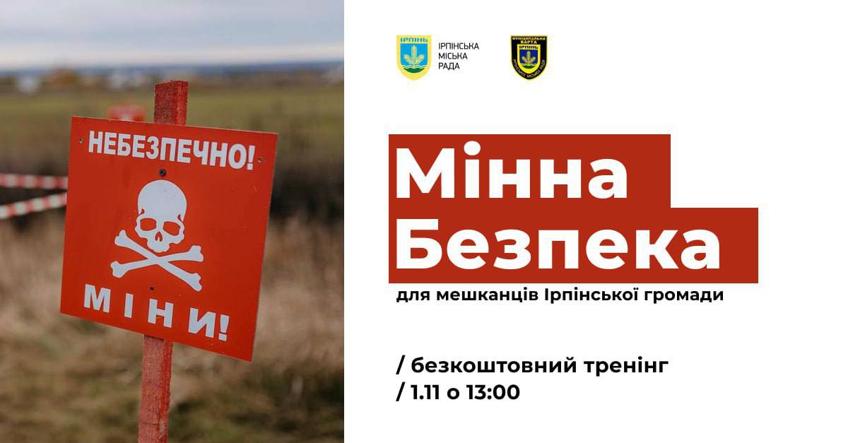 Ірпінська міська рада спільно з КП “Муніципальна варта” ІМР запрошують усіх охочих на безоплатний інформаційний тренінг із мінної безпеки.