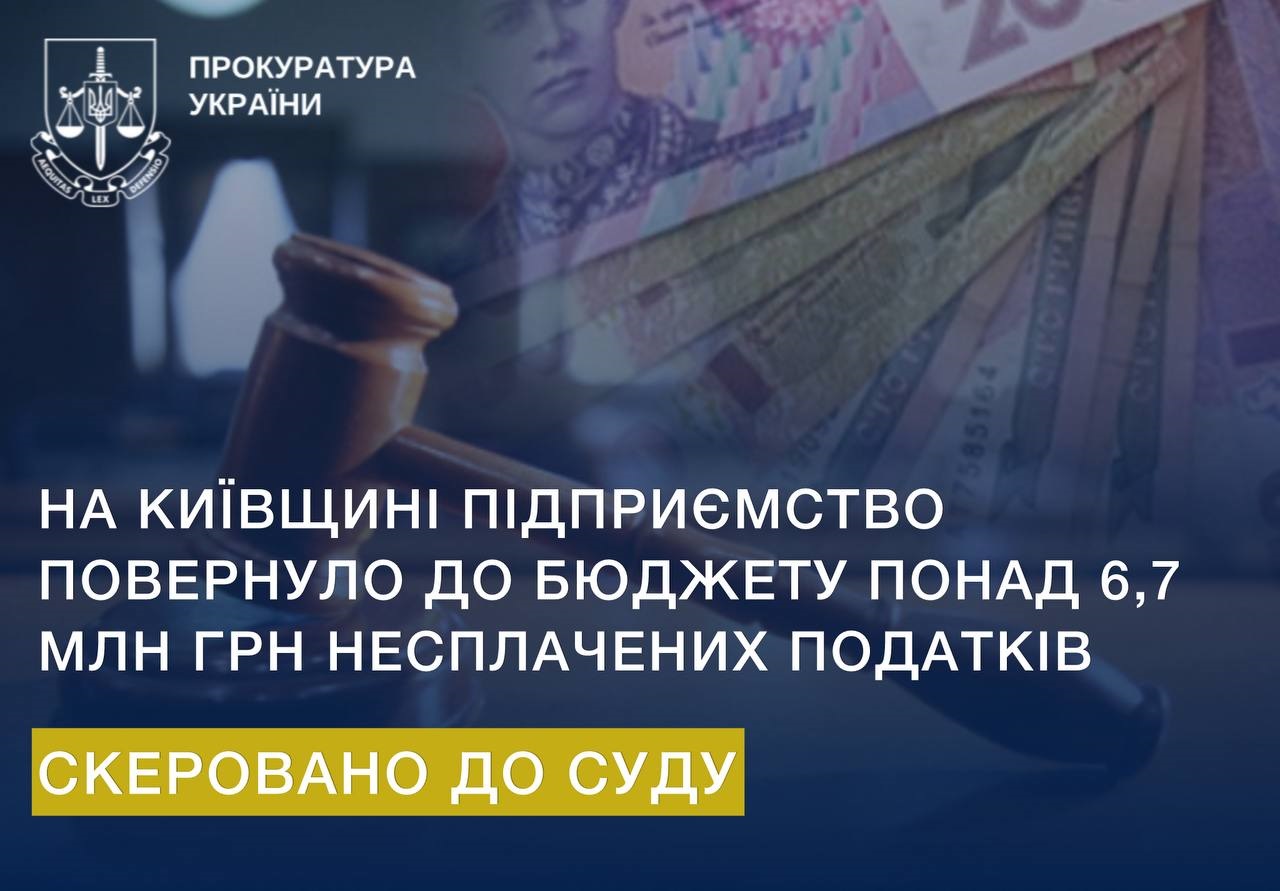 Прокурори Київської обласної прокуратури здійснювали процесуальне керівництво у кримінальному провадженні щодо ухилення від сплати податків, що завдало державі збитків на понад 6,7 млн грн. За даними слідства, компанія протягом тривалого періоду виконувала роботи з ремонту доріг та реконструкції будівель для державних і комунальних установ. Після отримання бюджетних коштів посадові особи підприємства не відображали реальні господарські операції у податковій звітності, чим умисно ухилялися від сплати ПДВ.