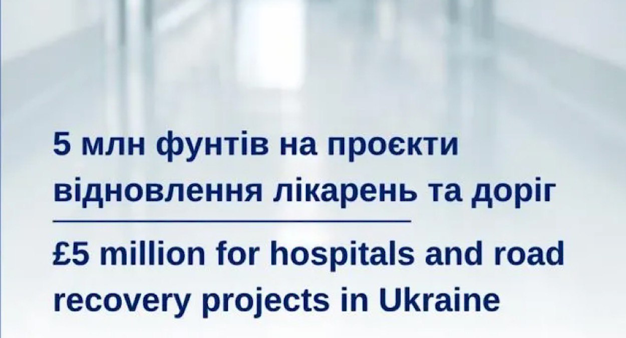 “Велика Британія допоможе з відновленням важливої цивільної інфраструктури в Україні. Внесок в розмірі 5,2 млн фунтів (275 млн грн) до програми Світового Банку з відновлення України підтримає втілення проєктів реконструкції двох лікарень в Києві та Ірпені та реновацію автошляху М-15 Одеса-Рені”, – йдеться в публікації посольства Великої Британії в Києві.