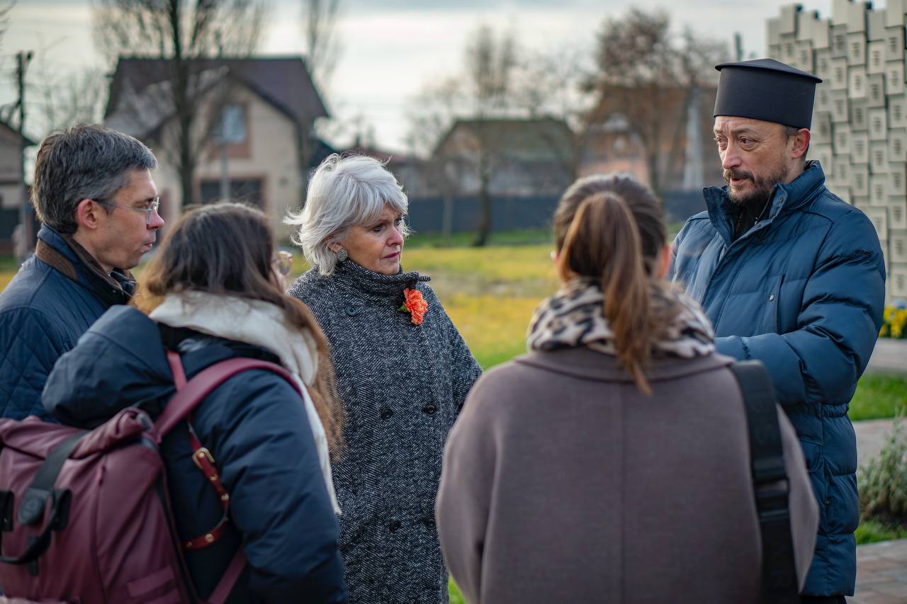На території храму Святого Апостола Андрія Первозванного іноземну гостю зустріли начальниця відділу міжнародних звʼязків та співробітництва Катерина Денисенко та настоятель церкви отець Андрій.